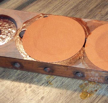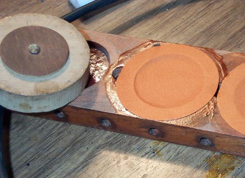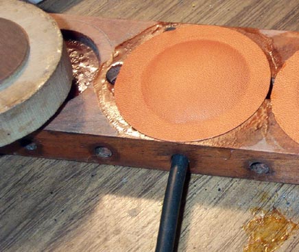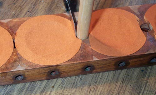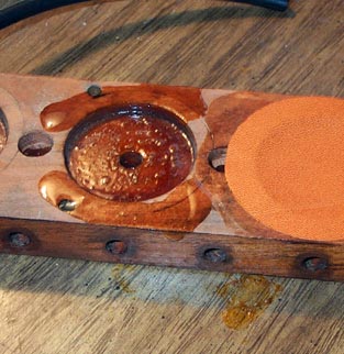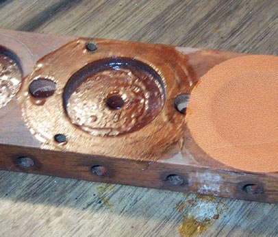 The pouch circle is then laid flat on the glued surface, and then "set" with a dipping tool. Mine is just a wooden disk with a 1-1/4" valve disk screwed on. It is important to push the dipping tool down hard, so that its rim firmly holds the edge of the pouch to the board, while the center pulls the leather evenly towards the middle.