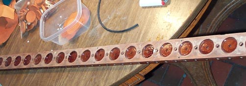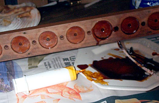 The shellac lining of the pouch wells and passages was refreshed with new shellac, brushed on then wiped off the gluing surface with an alcohol soaked paper towel. Shellac was injected into the passages with a disposable glue syringe and a pipe cleaner. Then the 3/8" holes for the cups were whiffed out with a drill to make a new bare wood surface for gluing in the new cups.