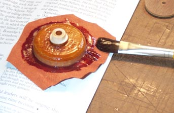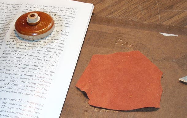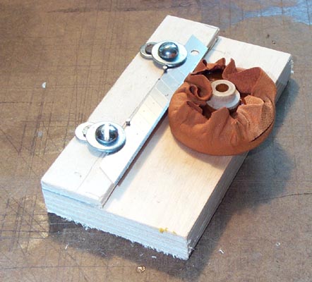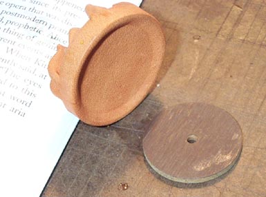 First the narrow front edge of the cup is glued to the pouch. I could not brush the glue onto the rim without getting glue inside the cup. It was easier to brush a thin layer of glue onto some scrap paper, and quickly dip the cup rim into this. Although the picture can't show it, the "dipping tool", a 1-1/4" organ valve disk, is under the piece of leather waiting to be glued, in the first picture. The glued cup is pushed down hard over this, trapping the setting disk inside the hollow part of the cup. The protruding edges of the leather are pulled taut while pressing the rim of the cup down on the table. This sets the edge glue joint and at the same time establishes the dip. Just like dipping an ordinary pouch, only in reverse.