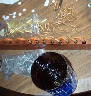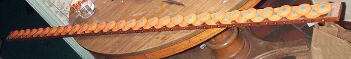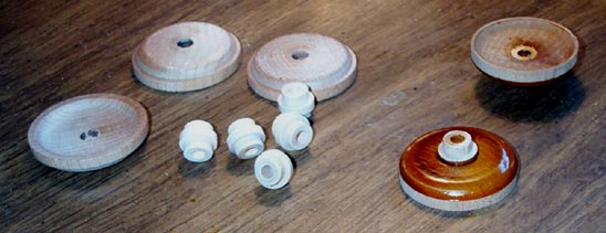 Many of the secondary pouch cups were lost; many of those that remained were corrupted by previous repairs using white glue. I had new turnings for cups made by Arnold Wood Turning Co. The original cups were made in one piece, with the tenon as part of the cup. But this is a complex tooling setup for a back knife machine, and makes the shellac sealing difficult. It was easier and cheaper to have the blanks made as two pieces, following Kevin McElhone's example when he has new cups made. First the bowl parts were painted with several coats of shellac to seal the wood. Then the gluing face on the edge, made deliberately wide on the blank, was trimmed off by spinning the cup against a router blade. The face of the cup was cleaned to bare wood with the belt sander, and the hole for the tenon piece was drilled 3/8". Finally the tenon piece was welded to the bowl with thick shellac. I have several more completed sets of cups for sale, in case someone else needs them.