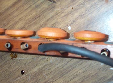 The elbows and nipples are installed with thick shellac. Blowing the pouches up into a hemisphere shows that the follower disks ride flat on top of the bulge. This proves that the followers are properly glued on only at the center, and that any edges of the disks are not stuck to the pouch surface.
