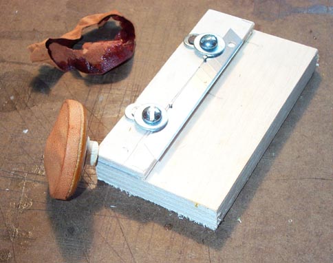 A tool was made to trim the leather just above the bare wood on the sides. The completed cup is rolled along the blade, and the excess leather and glue peels off the shellacked part of the cup easily.