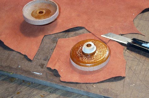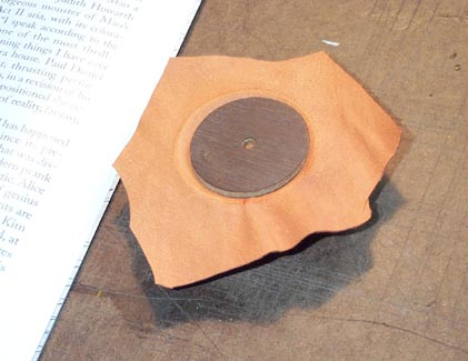 Pouch leather is cut into roughly shaped pieces. Leave at least 1/2" all around, so one can get a grip on the excess when the edge is pulled up around the rim.