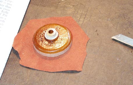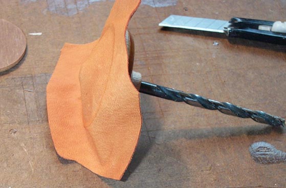 After this joint has set awhile, apply more glue to the margin of the leather and the side rim of the cup. Pull up the leather around the rim, and roll the edge against the table top. A 3/16" drill makes a handy handle. Grab the cup between the thumb and forefinger, holding the dipping disk inside the cup so the thin edge won't come loose. Pull the edges of the leather up and tight, frequently rolling and rubbing the edge against the table. At first the turned up lap looks ragged and wrinkled, but the pouch leather will stretch and mold to the rim, producing a nice, smooth result. Finally poke a thin stick up into the cup through the foot hole, stretching the active part of the leather to make sure it is not stuck anywhere inside the cup.