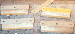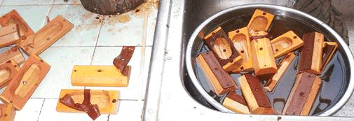 The cups are dipped in water to loosen the remnants of old leather, and cleaned off and dried. The cups are made of ordinary yellow pine. The stock from which they were made was edge jointed from narrow boards to preserve the quarter sawn orientation. Some of these joints came undone or opened partially, so a few of the cups ended up in two pieces. These were mended with permanent yellow glue.