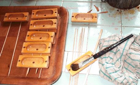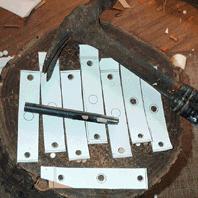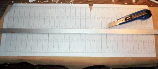 The cups are attached to the board with two #4 x 1-1/4 flat head wood screws. The first 13 cups, at the bass end, have wells the same width as the others, but of a slightly longer length, top to bottom. to get enough area to move the larger bass pallets.