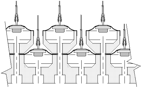 To allow enough pouch area to operate the playing valves, the pouches have to be too wide to all fit in one row on the 1" centers on the pouch board. Every other pouch is located on a removable wooden block, to form two overlapping rows of wider pouches. This horizontal cross section through the pouch board shows this.