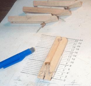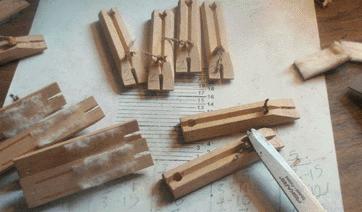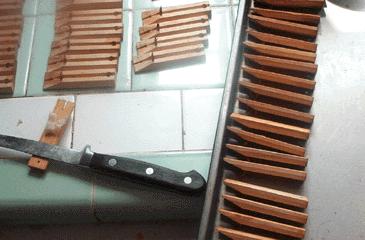 The glued pallets were quickly laid down on the composite strips, using the pencil marks on the edges of the sticks to guide them into correct position. (The pencil lines seen on the pallets are marks indicating which of the six ranks the pallet belongs to.)