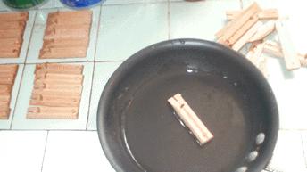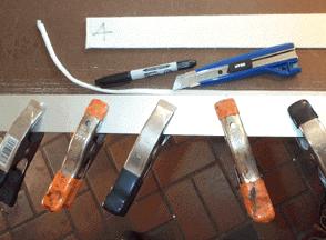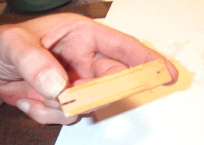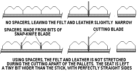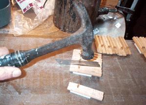 When the glue is dried, the pallets are cut apart by inserting a snap-knife blade between them, held perfectly vertical, and hitting the back of the blade with a hammer.