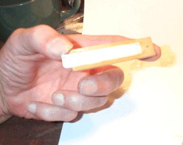 To get the last remnants of felt and glue off the sticks, the bottom of the pallets were immersed in a shallow pan of water, and left face down on the tile counter top. After about 20 minutes, the surprisingly stubborn ridges of glue softened, and could be cleanly scraped off without cutting the wood. Needless to say, sanding or dry scraping is impermissible here; the precisely made, absolutely flat surface of the sticks must be preserved.