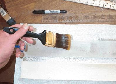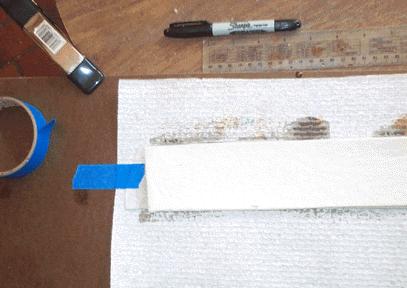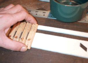 When the seats were originally glued to the pallets, the stick face was not glued all over. Apparently some type of heated roller wheel was used to apply two narrow lines of glue near the edges of the stick surface. There is a good reason for this; the same reason that vacuum reed organ felts are applied to the pallets with only a few drops of glue. Hot glue is an hygroscopic complex, just like wood. It can absorb atmospheric water and swell, but not necessarily at exactly the same rate as wood. A layer of glue covering the entire width of the pallet might swell or shrink differently than the wood due to changes in ambient relative humidity, causing the stick to warp or bow widthwise. In order to get two narrow lines of glue on the sticks quickly, I finally puzzled out this trick. Strips of sticky paper, made from Avery file folder labels, were cut 1/8" narrower than the pallets, and stuck on as shown. Then a thick coat of hot glue was brushed on, and the sticky paper was quickly pulled off. This left two narrow, but heavy streaks of glue on the edges of the stick.