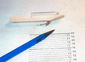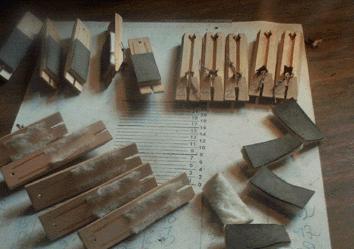 Each rank had several different kinds of pallets, depending on the size of the valve hole to be covered. Although the overall length of the pallets was the same for all, two different widths were used; 5/8" and 3/4". The part of the pallet covered with felt and leather varied in length from 1-1/2" to 2-1/4", in 1/8" increments. None of the ranks used the same combination of widths and lengths, so the pallets were kept apart by rank. The first step, before cleaning off the old seats, was to mark the points on the side of every pallet, indicating the end positions of the seat. Then a scale was made to easily measure the seat lengths, and the tip of the pallet was marked with a number, the second digit of the number of eighths; "2" = 12/8 0r 1-1/2" and "8" = 18/8 or 2-1/4".