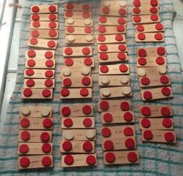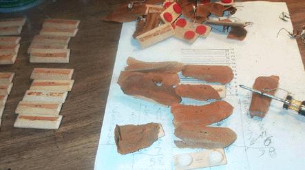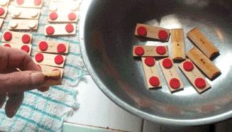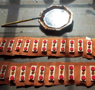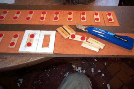 A clean piece of Masonite is made slightly sticky with Spraymount. The hide is laid flat on this, shiny side down, and is cut into strips as wide as the pouches are long. A template is put on the strip. The rounded side of the follower is spread with hot glue using a finger, along the "ridge line", and the follower is then pushed downward through the hole. The pouch is cut to width along the long edge of the template, and a second template is laid down along side the first one. Bu the time the second pouch is glued and trimmed, the first follower has gelled tightly to its pouch. Then the first template can be pulled off and set down farther along the strip. By thus leapfrogging the two templates along the strip, all the pouches are fairly quickly made. 270 small pouches and 78 big ones are required. This took six whole pouch skins; luckily I have more money than sense in my old age.