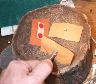 The old staple holes are located through the new leather using a strong light and an awl, and these holes are pricked through the leather. The new staples, with the leather tab already attached, are pushed through the holes. See the next chapter about the staples.