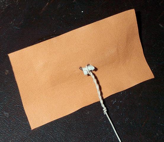 After the wire is twisted tight, the loop in the wire is pushed gently towards the pouch. This causes the loop to get slightly wider, and looser. The loop must be loose enough to swing freely, but not so big as to slip out from between the ears of the leather tab.