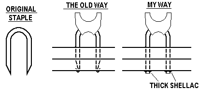 I could make such pointed staples, so I firmly fixed the staple another way. The new staples were pushed all the way through the holes, so their tips poked out just a little bit. Using a drop of thick shellac, the staple was "glued" into place. Shellac is the only adhesive that I know of, that adheres equally to wood and metal. This procedure also seals any leak where the staple was pushed through the old holes.