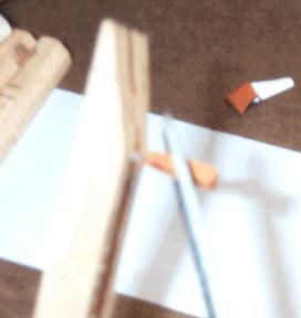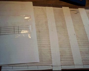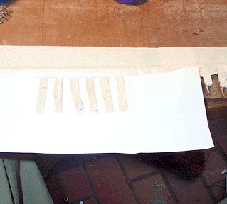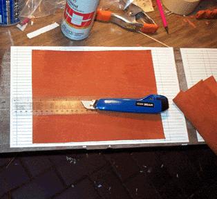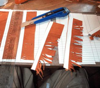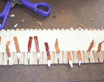 For the pallet ends, the tabs were attached after the staples were driven into the sticks. First a paper template with 1/4" parallel lines was made on Visio, stuck down to a cutting board, and made sticky on the surface with Spraymount. The hide was stuck down, and cut into 1/4" strips. Then 1/2" strips of paper were glued on the cut strips of leather as shown, and then unstuck from the template.