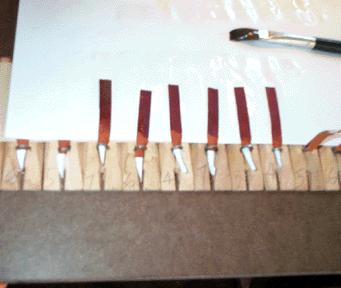 The pallets were lined up on a sticky board, and masking tape applied to cover up the part of the pallet that was to be glued. The tabs were cut apart, leaving the end stiffened with the paper in a point, to make it easy to thread it through the loop.