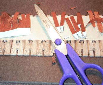For the staple on the pouches, I decided to put the tab on the staple first, before driving it into the pouch follower. I didn't want to be messing around with hot glue anywhere near the completed pouches. Leather Supply House Item CGK, 1 oz., .016 Goat-Kid was used here. With the same template, the hide was cut in 1/4" strips and reinforced with paper as before. But here the strips were cut apart differently, to form comb like arrays of tabs.