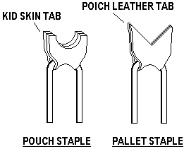 The link wires connecting the valve pallets and the pouch followers were attached with machine driven staples. The staples had little leather tabs, to prevent noise and binding, where the wires were looped around the staples. Two different forms of the tab were used. For the attachment to the pallet, the loop was fairly loose. The wire was just pushed through the staple and the free end was looped around the wire a couple of times during final assembly. At this end, the wire had to be free to rotate at right angles to the plane of the staple. This tab was made out of thin pouch leather. For the attachment to the pouch, the loop was twisted tighter, and the wire had to be free to rotate in a plane parallel to the plane of the staple. This tab was made of comparatively thick kidskin.