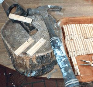The old staples were pulled out of the pallets, and new ones were driven in their place. The punch handle acted as an anvil, to limit the staple so it wouldn't protrude from the valve face of the pallet.