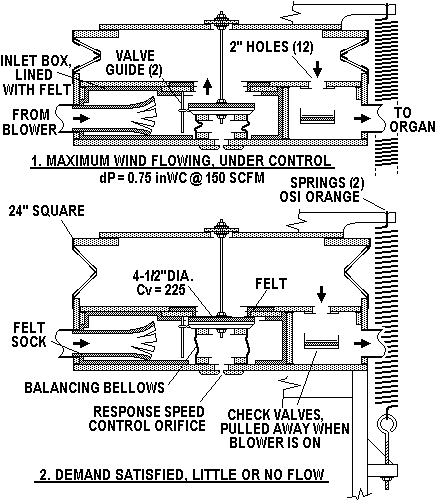 The design of this regulator is based on the Aeolian Company regulators furnished on their early pipe organs. The theory of operation, and another, simpler design, is described very thoroughly, in a paper by Johan Liljencrants, in the MMD Technical archives. This cross section shows the details of my design.
