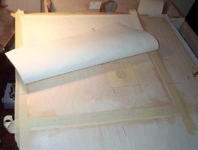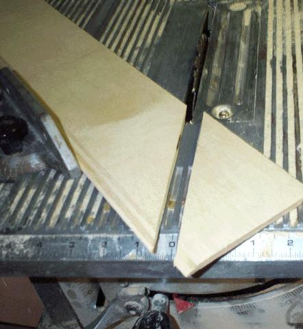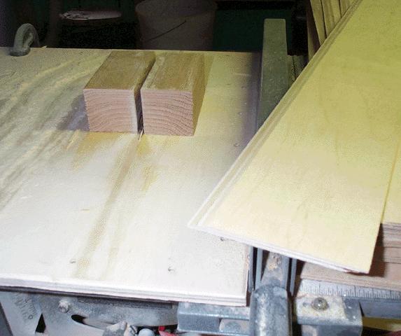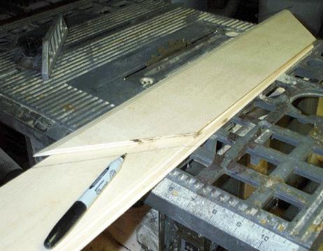 To cut the tapered edges of the ribs, made from 3/8" Finnish plywood, a guide for the table saw is made. The eight ribs are cut out, all the same size.