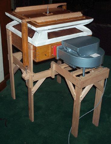 The blower is connected to the organ temporarily with 4" PVC drain pipe and OSI foil reinforced paper flexible trunking. On the rear cover of the big bass end "elbow box" connecting the reservoir to the left stop tower, there is a large hole, with a wooden cover. That is where I attached the blower hose. According to another owner, other Orchestrelles, even much older ones, have this apparently useless opening. I suspect that this is where the factory attached a hose from the plant wind supply, to power the organ during voicing and tuning. It would be very awkward and tiring to work on the ranks, while standing back and pumping, and trying to reach forward and up, to reach the reeds.