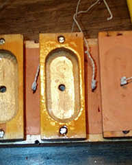 Carefully rub down the leather onto the glued surface. After gluing on the next pouch (leaving enough time for the glue to begin to gel), go back and dish the pouch by pushing the follower down to the bottom of the well. If any of the edges get unstuck, rub them back down. This seem to be a rather shallow looking dish, but it was the way the originals were done, and is plenty. Aeolian was clever with the cup dimensions here, providing a means to easily dish the pouches, and assuring the each one would have the same depth.