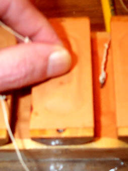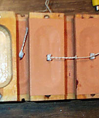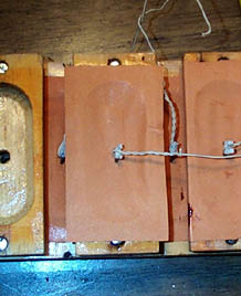 Unfortunately, a computer failure resulted in the loss of pictures of gluing the first, lower layer of pouches below the step-cups. However, the technique is essentially the same for both layers. After the lower layer is finished and tested, the cups are screwed on with 1-1/4" No. 4 screws. The screw holes are not exactly alike on many cups, so it is important to number the cups at disassembly, and put the back in the same order. Also, cup no. 21 is unique, having the holes for attaching the rank dividing plate holder.