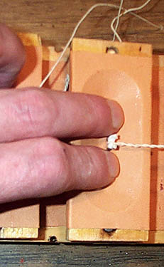 Spread a thin but wet layer of hot glue all around the edge of the well. Lay down the pouch, already prepared with the follower and the wire. The only guidance for getting the pouch and its follower centered on the well is to place the pouch edges centered vertically between the bottom and top of the cup block, and to lap the edges of the leather equally over the sides of the cup. Now the method of centering the pouch follower in the accurately cut pouch using a wooden die, pays off.