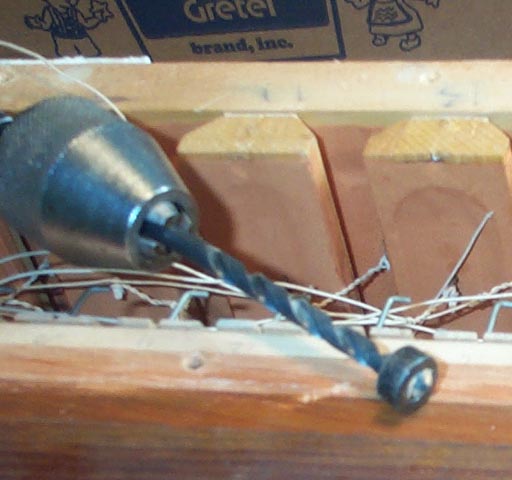 The two pieces are attached with four 1-1/2" no. 10 screws, through the gasketed end blocks. All the pouchboards look alike, but the lid screwholes are not the same on all ranks, so one must match up the numbered pouchboards with their associated valve boards. The end blocks are made of maple, which is shrinks less than the sugar pine used for the pouch and valve boards. So the end blocks must be planed or sanded down so their tops are perfectly level with the edges of the main boards. At this time, a small countersink is drilled around the chest lid screwholes. The objective here is to make a perfectly flat surface where the chest lids will ultimately be screwed on. The blotting paper gaskets on the lids do not have much compliance to absorb any irregularities on these surfaces, and one wants these joints to be leak tight as any other.