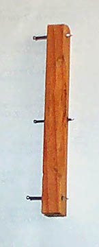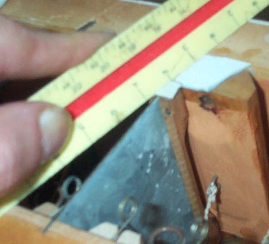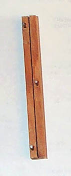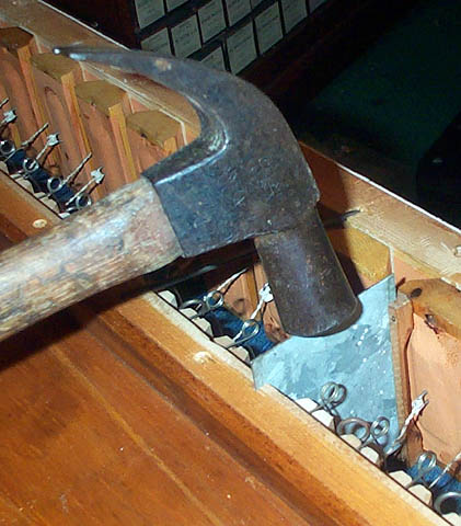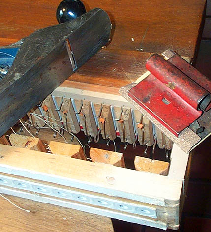 To complete the picture of the chest assembly, skip aheat to the next chapter and hook up the link wires, and come back to install the rank devider plate, between notes 21 and 22. This rectangular piece of organ zinc fits tightly into two grooves, one between the pallets on the valve board, and the other in the guide strip discussed above. It is carefully hammered down into the grooves.