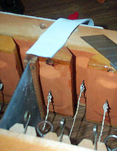 The top and bottom of the entire divider must be perfectly level with the edges of the boards, so that it evenly contacts the crosswise piece of gasket in the center of the rank lids. The cup block and the guide strip are slightly shorter than the width of the pouch board, so bits of leather of various thicknesses are glued on to build up this surface where needed.