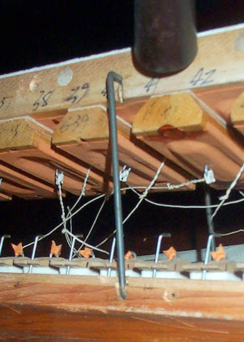 On two places on both sides of each assembly, there were heavy iron wire staples that connect the front and back halves. One might suppose that these spacers were redundant, since the screwed on lids surely hold the chest firmly together. But I think these staples served an important purpose. The distance between the pouch followers and the pallets is very critical, so that the link wires do not end up too short. and cause the pallets to simmer. The collective tension of all the link wires being twisted up during subsequent assembly may tend to deflect the thin pouchboard inwards a little bit. Adding the staples holds the gap between the pouches and the pallets to a very rigidly fixed distance. So the old staples were bent back straight (some of them were bent crooked by dirving them out at takedown), and hammered back into their grooved holes.