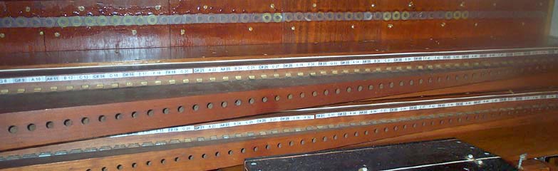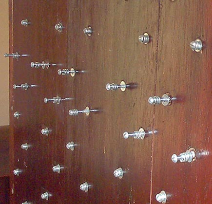 For each rank location, there were two 3/16" wooden dowels driven into the ends of the outermost channel panels. It is important to allign the rank so that the mounting screw holes and the channel holes line up accurately. But the rank chests are very heavy, and almost all of the dowels were boken off. I replaced them with long #8 woodscrews with the heads cut off and the shanks ground to a smooth, rounded tip. The matching holes in the chest backs were countersunk so the new metal dowels would center to them easily. Now, when the heavy and awkward to handle chests were set into thier spaces, they could be firmly pushed into thier correct place against the boards with no problem.