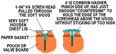 Install the lids on the tops and bottoms of the chests, as they are done. The lids are made of quarter sawn fir, only 1/4" thick. Although this is very good, stable lumber, some of it is very soft. In the case of one of the ranks, this wood was so soft that the little No. 6 flat head screws had pulled right through, crushing and pushing aside the wood around some of the holes. The ranks are so close together vertically, that there is not enough room to replace these screws with round headed screws and washers. I finally puzzled out a solution, as shown below: