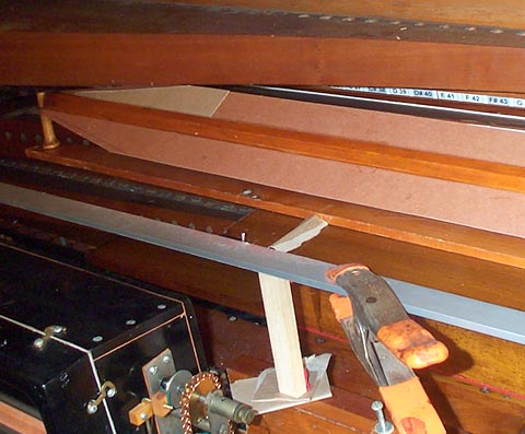 After using the vox for a while, I decided to experiment. The vox still took an awful lot of wind. Of course many people have observed that the Orchestrelle vox humana does make for a lot more pumping effort, even in the best of situations. Like on any reed organ, this imposes a practical limit on its utilization. But still I wanted to see if it would work ok using somewhat less air flow. So I opened the gasketed joint between the distribution block and the turbine, and slid a piece of card into the joint, to act as an adjustable valve.