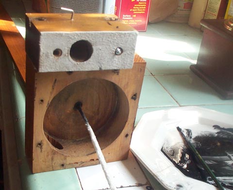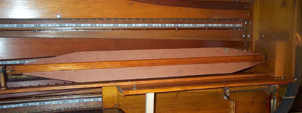 The assembled vox was installed in the organ swell box, and connected to wind for testing. When the divided floor of the swell box was propped up to its final level, a slight interference between the blades and the big Helmholz resonator was found. Using the blade template again, the blades were marked for further trimming.