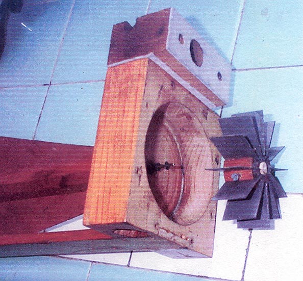 After the paddle assembly and the turbine hub are finished, they are put together on the frame. First the bearing holes in the turbine and the support post at the other end, are lubricated with an alcohol soaked pipe cleaner, dipped in graphite. The next picture is not very good; the computer file got corrupted, so I had to scan the printed version. But the principle can be seen. The longer pin on the paddle shaft is inserted through the inner wall of the turbine case. The flat side of the turbine hub assembly is slipped over the pin. Number 4 fiber washers, the same as used on the key pivot screws (see Chapter 12.2) are used as bearing spacers on the pin. One washer (not shown) is put on the pin between the end of the paddle axle and the outside of the turbine case. Four of them are put on the pin, inside the turbine, to establish the space between the blades and the bottom of the turbine cavity.