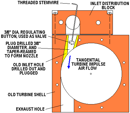 Some care, and trial-and-error is required here. The hub must be located on the pin such that the turbine rotates more or less midway between the bottom of the cavity, and the inner surface of the turbine lid. The final position of the hub on the pin is somewhat critical. The horizontal slop of the assembled rotating parts must be large enough to prevent binding, but not so loose that the assembly could shift to the right, and allow the turbine to rub against the turbine lid. Originally, the hub was just force fitted on the pin, but this method will not hold reliably now. I put small set screws in the hub (one on each side, to preserve the balance), to cure this.