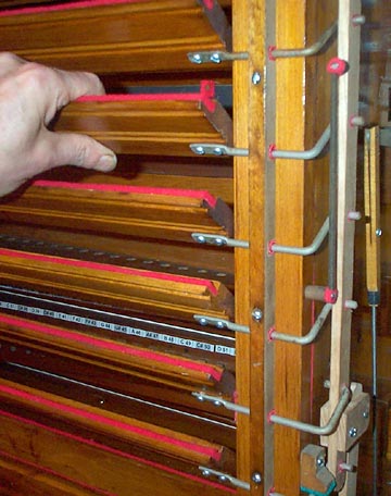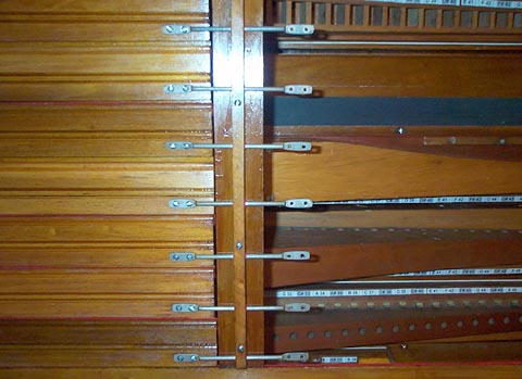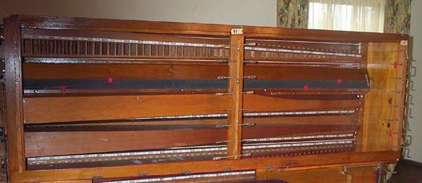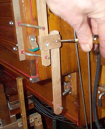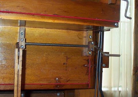 There is a roller crank under the floor of the swell box, to transfer the movement of the knee-swell linkage to the outer side of the swell box. Chapter 11 shows more detail of the lower parts of the knee-swell linkage. The split block flanges were rebushed, as in Chapter 11, and remounted. These blocks had to be carefully shimmed with paper, to get them parallel and plumb to the board, and allow the crank to turn with perfect freedom.