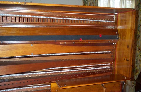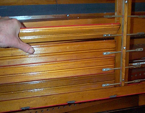 The side and top panels, and parts of the bottom panels of the swell box, are assembled onto the organ. To avoid uncontrolled excape of sound, and to avoid sympathetic rattling, all the places where these part join up, were edged with medium nameboard felt strip. This seems not to have been done originally, but what the hell; let me have my fun!
