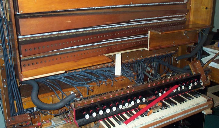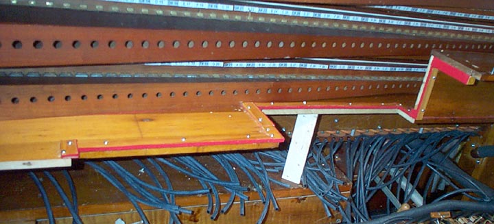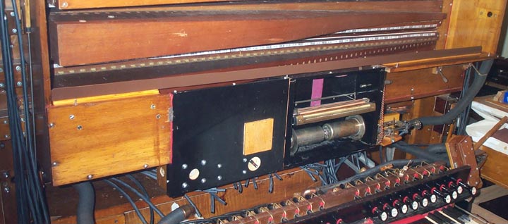 Also, this shot shows the spoolbox wind cutoff valve on the back of the extension board where the spoolbox glass window is stowed when open. The plugged holes in the center of this board shows where the valve was originally located. The valve had to be moved down and to the left, to clear the bottom swell box panel. Note the pneumatic and valve disk to the right of the cutoff valve. This is an item I had to add, since the last time I discussed the spoolbox. I discovered that when the instrument was switched to 'reroll' and the wind cutoff valve closed, wind trapped in the spoolbox caused to notes to continue to play annoyingly during rewind. The pneumatic is held closed by a spring. When the key pallet chest is winded by the "Pneumatic to Manual" (reroll) stop, that pressure inflates the pneumatic (as well as the cutoff valve pouch); opening the valve and venting the spoolbox immediately.