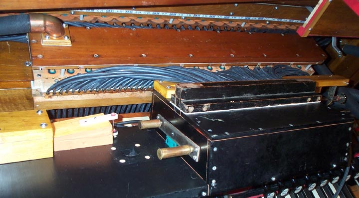 First the short tubes between the key valve chest and the primary were installed. This held the primary box firmly in place. Then the tubes from the primary and the secondary pouch rail were fitted. Finally the tubes from the back of the tracker bar were fitted to the primary tube rail. One can see here, how the spool box can be swung down, to gain access to primary and secondary valves. It's tight, but nobody has ever accused Aeolian of designing anything that was easy to get into.