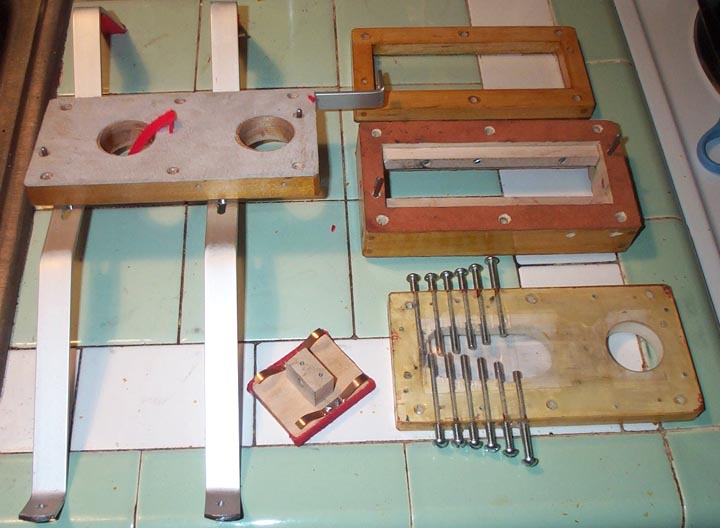 The four layers have snugly fitted aligning pins, so the parts go back