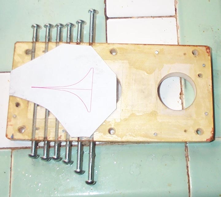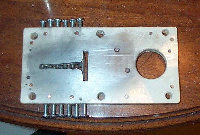 A rough layout of the slot was made; the plastic sheet was glued on, and the slot was roughed out with a drill. Then the final outline of the slot was made with a file.