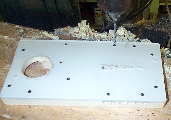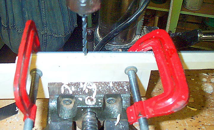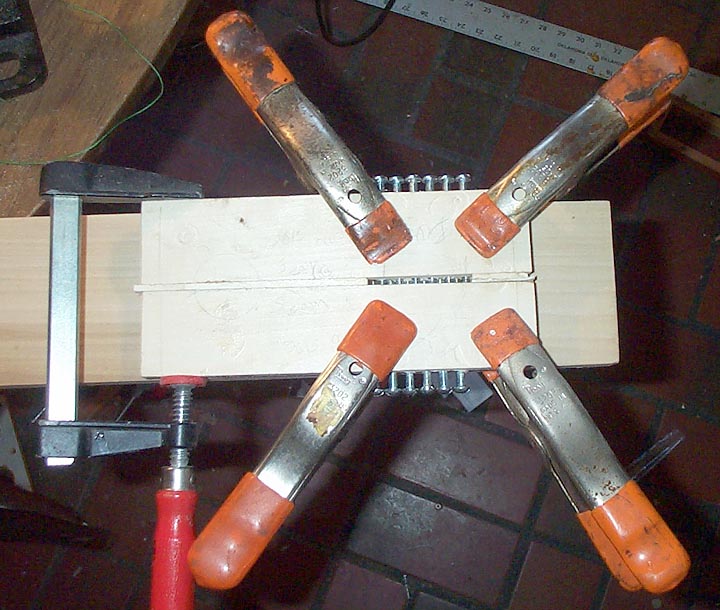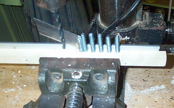 One of the unique features of Aeolian organ tempo valves is an array of interlocking #10 machine screws just below the tempo slot. These are used to accurately calibrate the tempo at each setting. Getting the rows of the screws to interlock at the center is a bit tricky. The valve layer was divided into two halves; each half drilled separately. First a template was drilled, using a bit of screw and a thin shim between each hole so that the holes were spaced properly. A strip of aluminum clamped behind the wood made sure that the holes were close to one edge as possible.