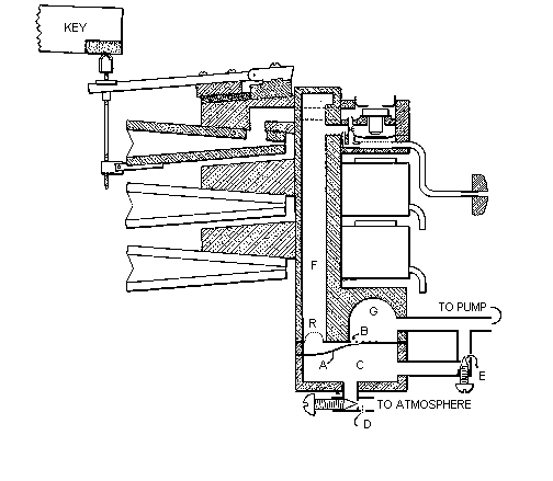 If E were open and D tightly closed, pump suction through E would pull the pouch completely away from the grid and full pump suction would be admitted to the wind chest F.