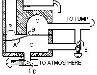 The chamber C under the pouch is connected to pump suction through the adjustable opening E and to atmosphere through the variable opening D.